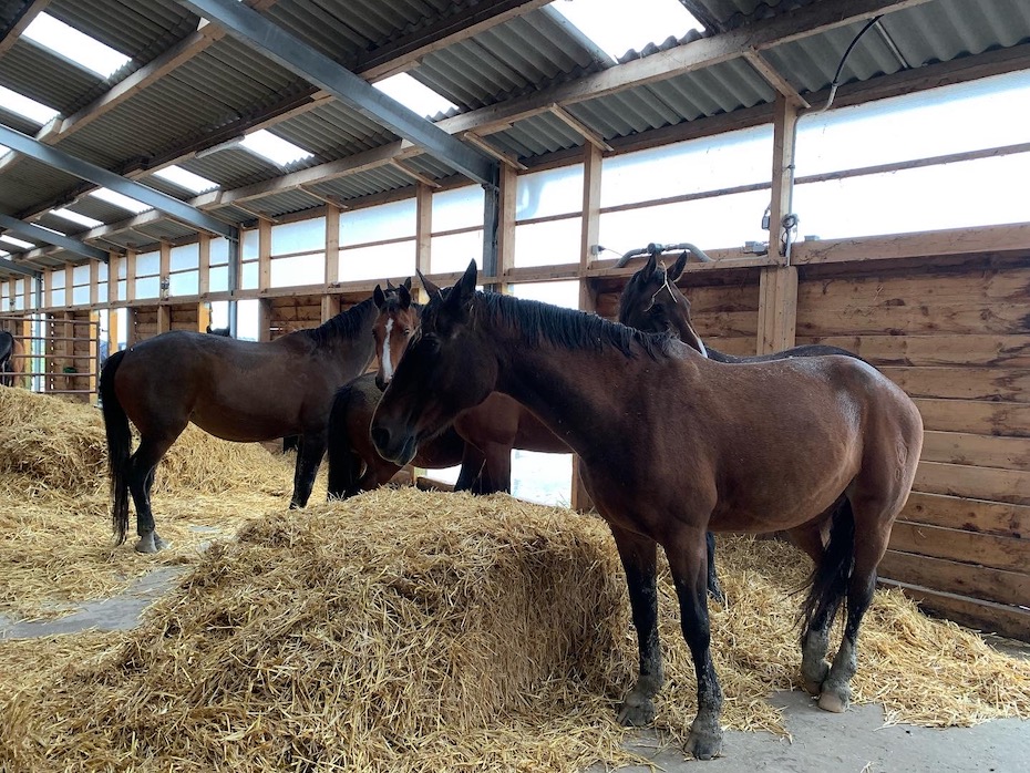 Unser Offenstall bietet viel Bewegung an der frischen Luft mit sozialem Kontakt in nach Wallach und Stuten getrennten Herden. Es gibt mehrere große Futterplätze, wo Heulage ganztägig zur Verfügung steht. In dem großen Strohliegebereich können sich die Pferde zurückziehen. Außerdem stehen mehrere Tränkeplätze zur Verfügung.
